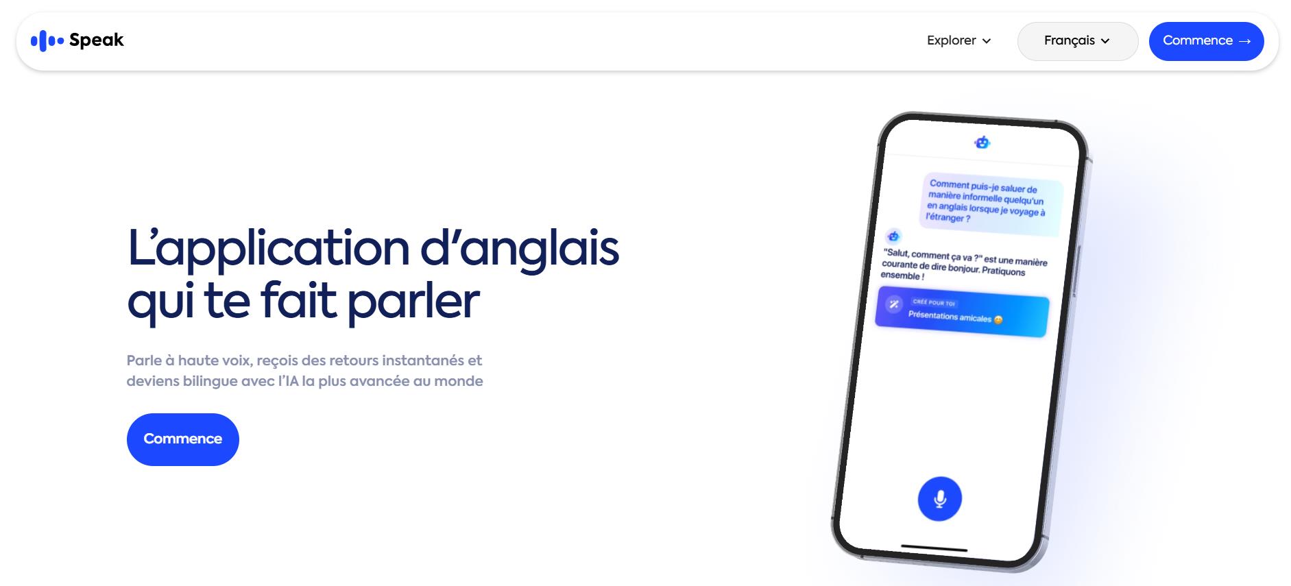 Cette application IA pour apprendre les langues propose une méthode d'apprentissage diversifiée et ludique, en permettant aux utilisateurs de travailler sur différents aspects de la langue. Vous pourrez ainsi vous exercer à la prononciation, suivre des sessions d'expression orale en direct pour vous entraîner, apprendre du vocabulaire avec des contenus visuels pour faciliter la mémorisation, améliorer la compréhension orale, et bien sûr, échanger en conversation avec l’IA. Cette approche flexible et interactive permet à chacun d’apprendre une langue à domicile suivant son propre rythme tout en développant toutes les compétences nécessaires pour maîtriser la langue. L'application est disponible sur iOS et Android.