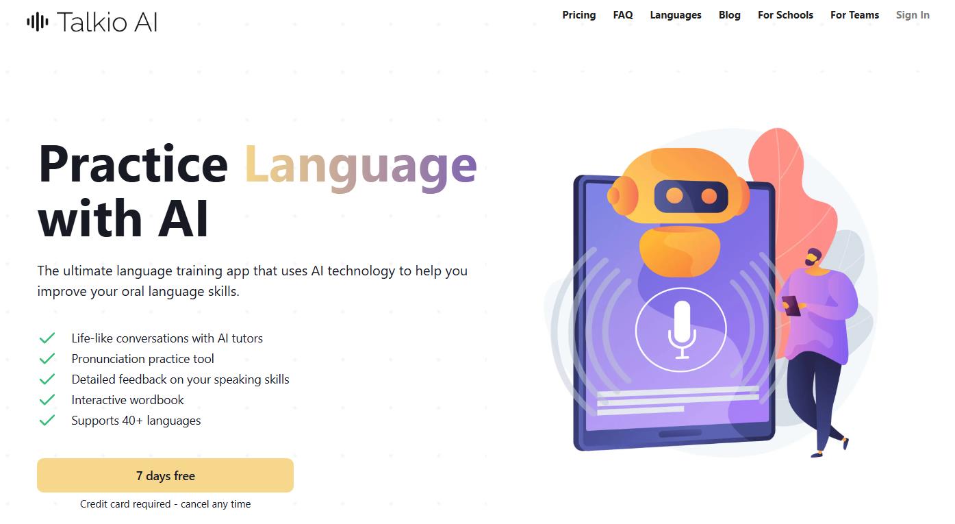 Talkio est une application IA pour apprendre les langues principalement conçue pour vous permettre d’améliorer vos compétences orales. Vous pouvez engager des conversations en voix avec des “tuteurs IA” (des professeurs virtuels IA) pour pratiquer votre prononciation, recevoir des retours détaillés lors de vos échanges, et construire un vocabulaire actif via un “wordbook interactif” (un cahier de mots interactif). L’outil s’adresse aux apprenants de tous les niveaux, notamment ceux qui souhaitent franchir le cap de la conversation directe plutôt que se cantonner aux exercices passifs.