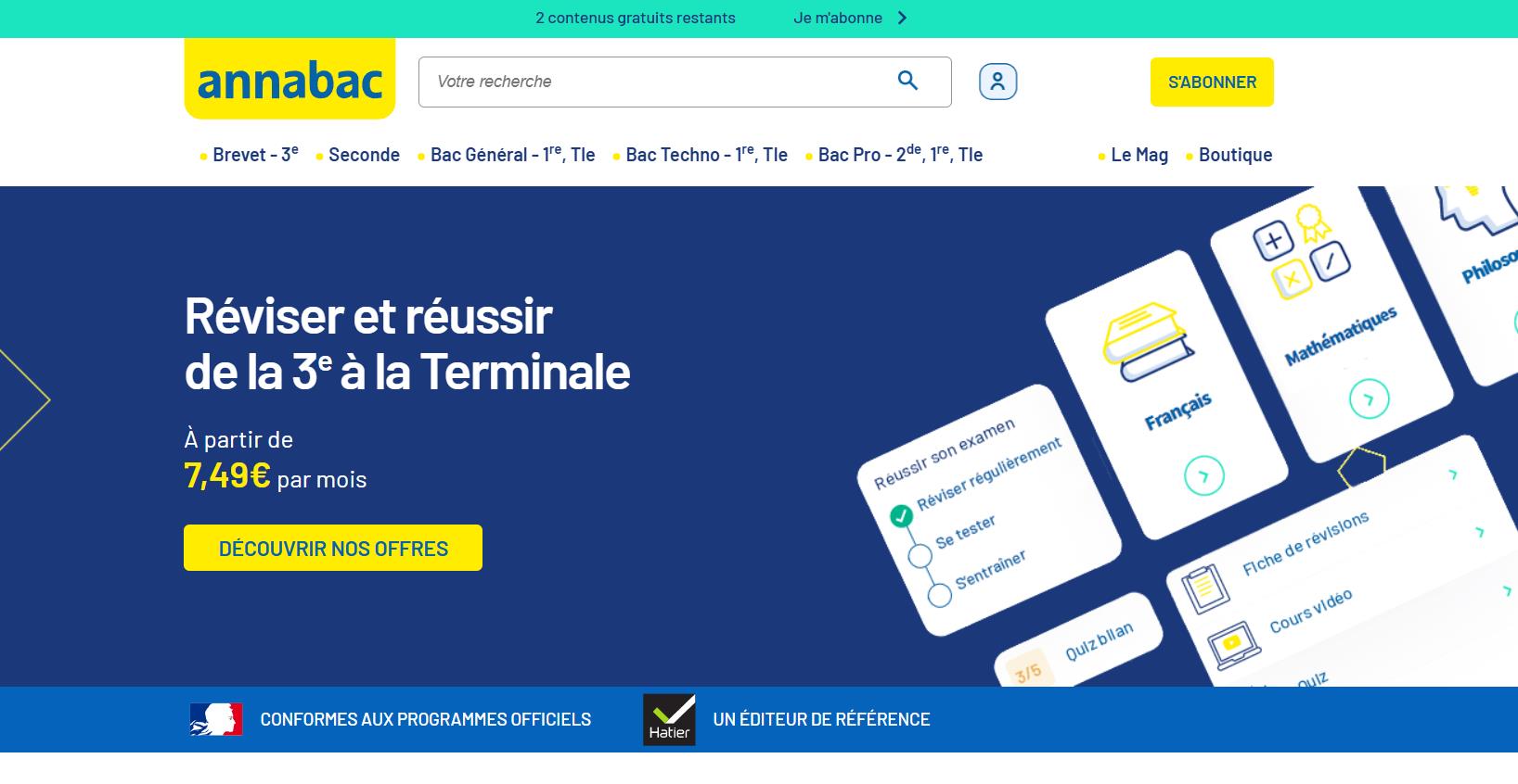 Annabac est l'une des références les plus connues pour réviser les examens en France. Développée par les Éditions Hatier, la plateforme propose des fiches de révision, des cours en vidéo et en podcast, des quiz interactifs et des annales corrigées. Si Annabac est principalement connue pour le bac, elle couvre également les matières de 3e, ce qui en fait un bon site de révision pour le brevet. Les contenus sont rédigés par des professeurs agrégés et certifiés, et régulièrement mis à jour pour correspondre aux programmes officiels.