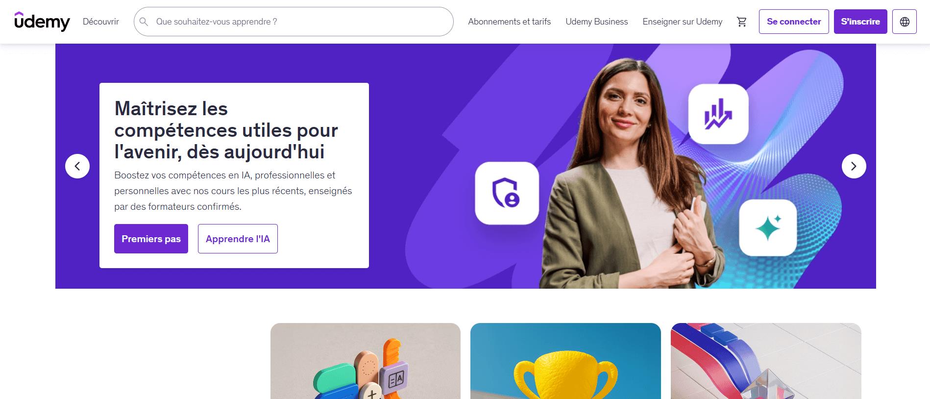 3 - Udemy : Une plateforme idéale pour développer des compétences pratiques avec une large sélection de cours à votre rythme. Les utilisateurs bénéficient d'un accès à vie aux formations, ce qui permet de revenir facilement sur les leçons.